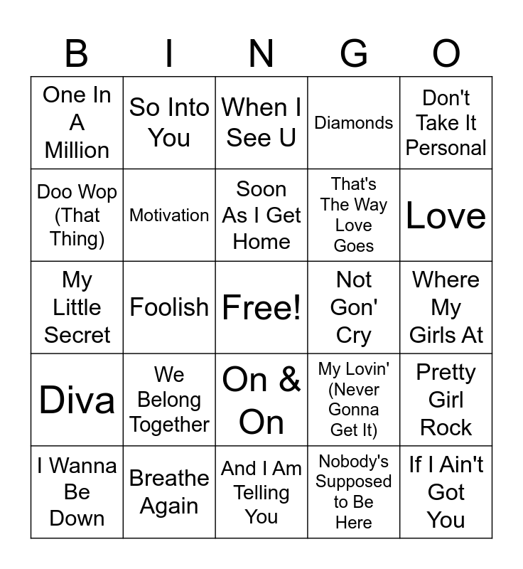 This bingo card has a free space and 24 words: We Belong Together, Breathe Again, Soon As I Get Home, I Wanna Be Down, Don't Take It Personal, One In A Million, Doo Wop (That Thing), So Into You, Not Gon' Cry, On & On, That's The Way Love Goes, My Little Secret, My Lovin' (Never Gonna Get It), Pretty Girl Rock, Motivation, Nobody's Supposed to Be Here, Where My Girls At, When I See U, Love, Foolish, If I Ain't Got You, Diva, Diamonds and And I Am Telling You.