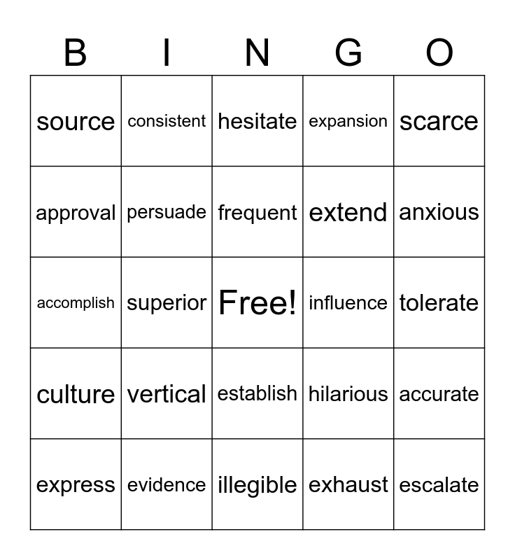 This bingo card has a free space and 24 words: vertical, evidence, frequent, express, scarce, source, approval, consistent, influence, establish, extend, accomplish, hilarious, accurate, persuade, exhaust, tolerate, hesitate, anxious, superior, escalate, culture, expansion and illegible.