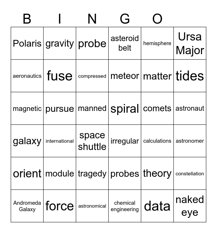This bingo card has 103 words: atmosphere, axis, hemisphere, universe, eclipse, planet, orbit, solar system, rotate, celestial bodies, core, debris, meteoroids, satellites, terrain, naked eye, probe, frigid, Free!, greenhouse, NASA, polar, gas giant, hydrogen, aseroids, comets, meteor, asteroid belt, Halley's comet, metiorite, galaxy, astronomer, billion, Milky Way Galaxy, Andromeda Galaxy, astronomical, atoms, cluster, fuse, irregular, light-years, spiral, constellation, Ursa Major, Ursa Minor, Polaris, ladle, magnetic, navigate, orient, orienting, module, probes, reusable, spacecraft, triumph, observatory, launch, Hubble Telescope, astronaut, manned, Apollo 11, gravity, attraction, black hole, force, gravitational pull, gravity, matter, tides, calculations, diurnal, geocentric, heliocentric, hypothesis, logical, opposed, space shuttle, shuttle, booster rocket, especially, unmanned, aeronautics, applications, pursue, refugees, tragedy, African American Studies, chemical engineering, Peace Corps, health care, endeavor, international, data, expanding, phenomenon, compressed, theory, Bing Bang theory, astrophysicist, matter, sphere and Language Studio.