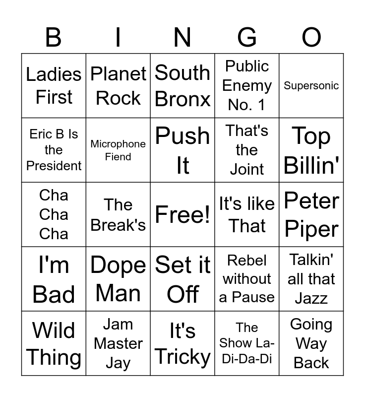 This bingo card has a free space and 24 words: Dope Man, Jam Master Jay, Push It, Wild Thing, Supersonic, Ladies First, Eric B Is the President, Planet Rock, It's like That, Set it Off, That's the Joint, Cha Cha Cha, Rebel without a Pause, Talkin' all that Jazz, Microphone Fiend, The Show La-Di-Da-Di, Peter Piper, South Bronx, Top Billin', The Break's, Going Way Back, I'm Bad, Public Enemy No. 1 and It's Tricky.