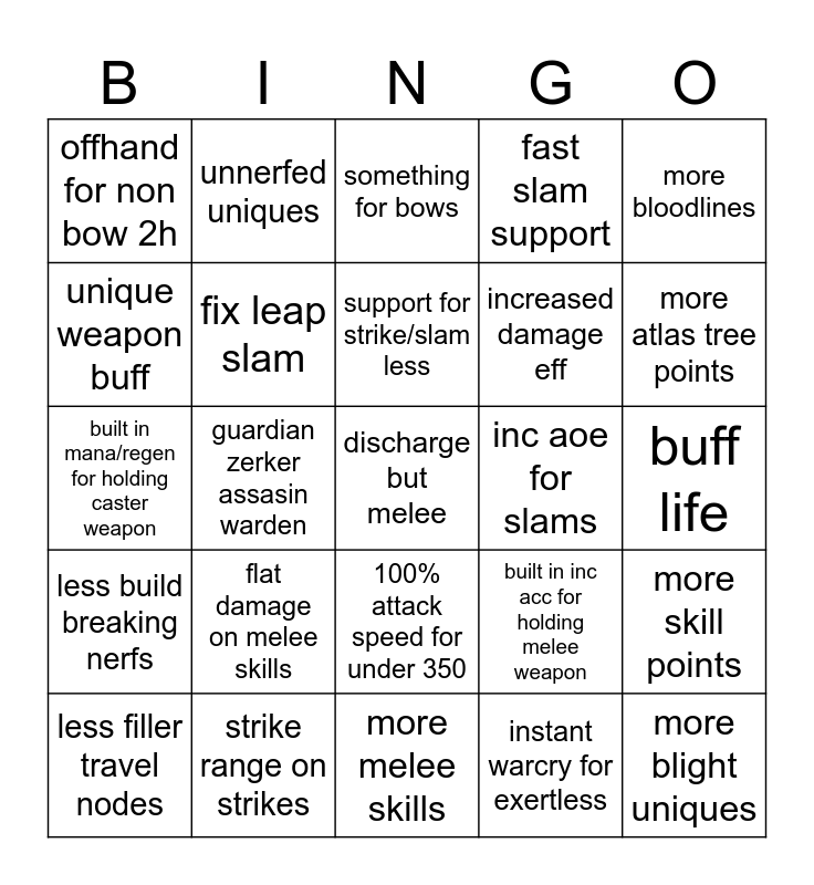 This bingo card has a free space and 24 words: flat damage on melee skills, strike range on strikes, support for strike/slam less, less filler travel nodes, more bloodlines, offhand for non bow 2h, unique weapon buff, unnerfed uniques, inc aoe for slams, 100% attack speed for under 350, increased damage eff, built in mana/regen for holding caster weapon, built in inc acc for holding melee weapon, more skill points, fix leap slam, instant warcry for exertless, buff life, something for bows, more atlas tree points, guardian zerker assasin warden, more blight uniques, less build breaking nerfs, fast slam support and more melee skills.