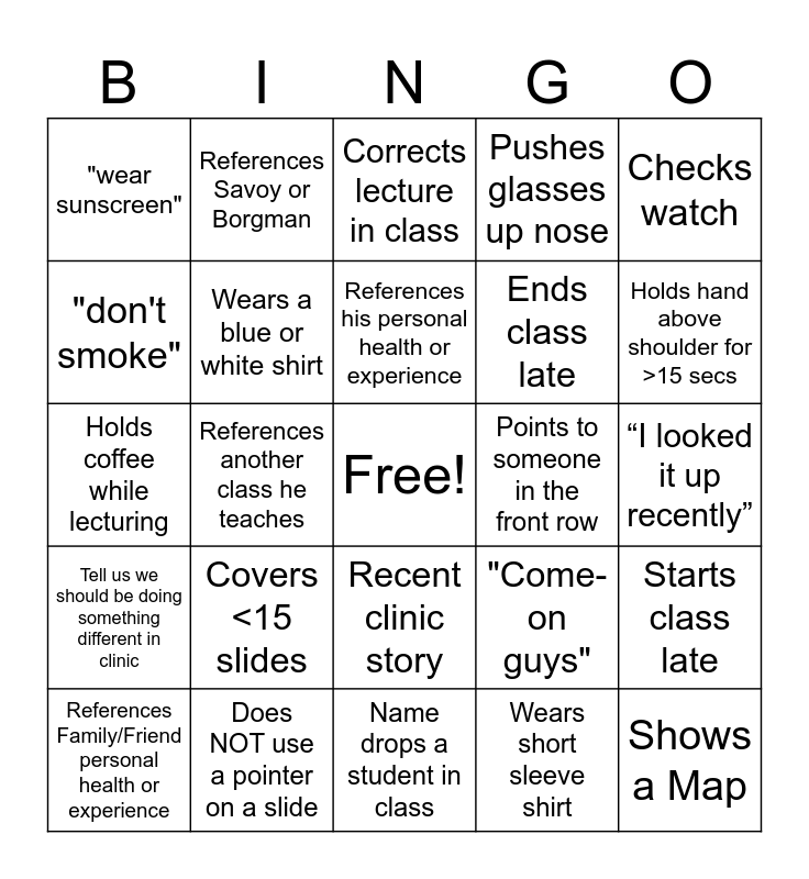 This bingo card has a free space and 25 words: Covers <15 slides, Name drops a student in class, References his personal health or experience, References Family/Friend personal health or experience, Checks watch, "wear sunscreen", "don't smoke", References Savoy or Borgman, Points to someone in the front row, Recent clinic story, Ends class late, Holds coffee while lecturing, "Come-on guys", Starts class late, Wears a blue or white shirt, Ends class early, “I looked it up recently”, Corrects lecture in class, Holds hand above shoulder for >15 secs, References another class he teaches, Shows a Map, Does NOT use a pointer on a slide, Tell us we should be doing something different in clinic, Pushes glasses up nose and Wears short sleeve shirt.