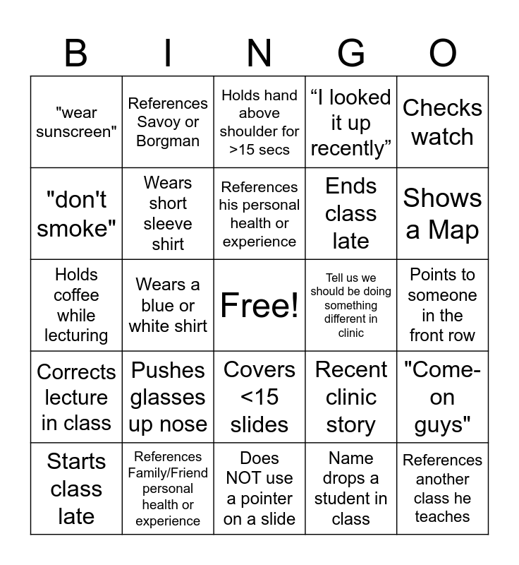 This bingo card has a free space and 26 words: Covers <15 slides, Name drops a student in class, References his personal health or experience, References Family/Friend personal health or experience, Checks watch, "wear sunscreen", "don't smoke", References Savoy or Borgman, Points to someone in the front row, Recent clinic story, Ends class late, Holds coffee while lecturing, "Come-on guys", Starts class late, Wears a blue or white shirt, Ends class early, “I looked it up recently”, Corrects lecture in class, Holds hand above shoulder for >15 secs, References another class he teaches, Shows a Map, Does NOT use a pointer on a slide, Tell us we should be doing something different in clinic, Pushes glasses up nose, Wears short sleeve shirt and Asks class to raise hands on a question.