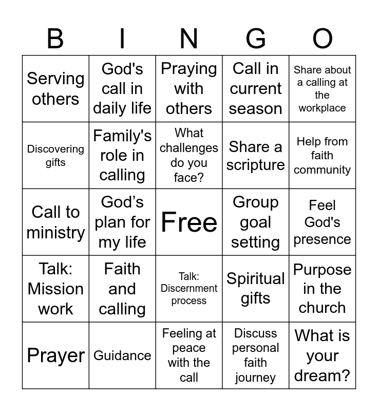 This bingo card has a free space and 24 words: Faith and calling, Guidance, What challenges do you face?, Prayer, Share about a calling at the workplace, Serving others, Discovering gifts, God's call in daily life, Group goal setting, Talk: Discernment process, Share a scripture, Call to ministry, Spiritual gifts, Purpose in the church, Family's role in calling, Discuss personal faith journey, Feel God's presence, Praying with others, Help from faith community, God’s plan for my life, What is your dream?, Talk: Mission work, Call in current season and Feeling at peace with the call.