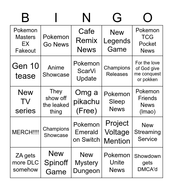 This bingo card has a free space and 24 words: ZA gets more DLC somehow, Champions Showcase, Pokemon ScarVi Update, Pokemon Unite News, Pokemon TCG Pocket News, Pokemon Masters EX Fakeout, Pokemon Go News, Cafe Remix News, Pokemon Sleep News, Pokemon Friends News (lmao), New TV series, Anime Showcase, Project Voltage Mention, New Streaming Service, Gen 10 tease, New Spinoff Game, New Mystery Dungeon, New Legends Game, For the love of God give me conquest or pokken, MERCH!!!!, They show off the leaked thing, Pokemon Emerald on Switch, Champions Releases and Showdown gets DMCA'd.