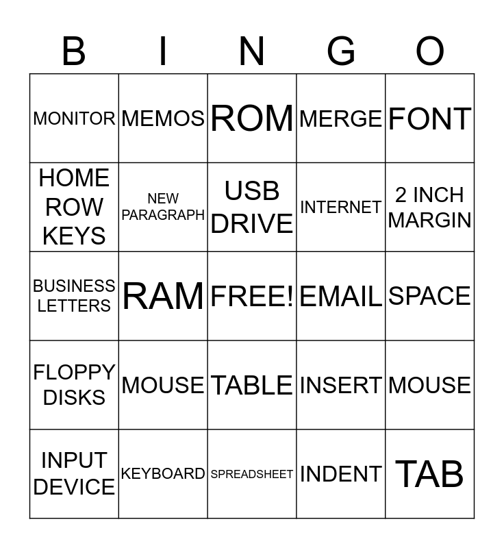 This bingo card has a free space and 24 words: MOUSE, KEYBOARD, USB DRIVE, INPUT DEVICE, FONT, MONITOR, HOME ROW KEYS, MEMOS, EMAIL, TABLE, INTERNET, BUSINESS LETTERS, INSERT, MOUSE, NEW PARAGRAPH, INDENT, SPACE, ROM, 2 INCH MARGIN, RAM, TAB, FLOPPY DISKS, MERGE and SPREADSHEET.