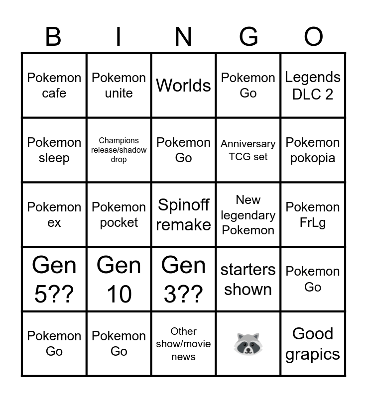 This bingo card has 30 words: Pokemon Go, Merch, Pokemon pocket, New Pokemon spinoff, Pokemon cafe, Worlds, Champions release/shadow drop, Gen 3??, New legendary Pokemon, Other show/movie news, Pokemon FrLg, Spinoff remake, 🦝, Good grapics, Pokemon pokopia, Anime news, starters shown, Gen 5??, Gen 10, Legends DLC 2, Pokemon ex, Pokemon remake game, Pokemon unite, Anniversary TCG set, Pokemon sleep, Pokemon Go, Pokemon Go, Pokemon Go, Pokemon Go and Pokemon Go.
