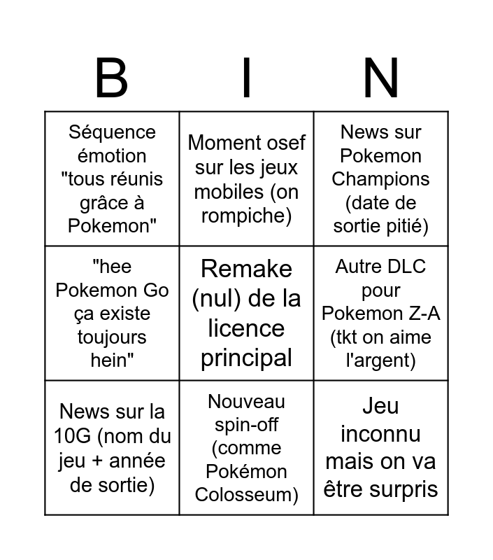 This bingo card has a free space and 9 words: News sur la 10G (nom du jeu + année de sortie), News sur Pokemon Champions (date de sortie pitié), Moment osef sur les jeux mobiles (on rompiche), "hee Pokemon Go ça existe toujours hein", Séquence émotion "tous réunis grâce à Pokemon", Autre DLC pour Pokemon Z-A (tkt on aime l'argent), Jeu inconnu mais on va être surpris, Nouveau extension de carte Pokemon and Nouveau spin-off (comme Pokémon Colosseum).