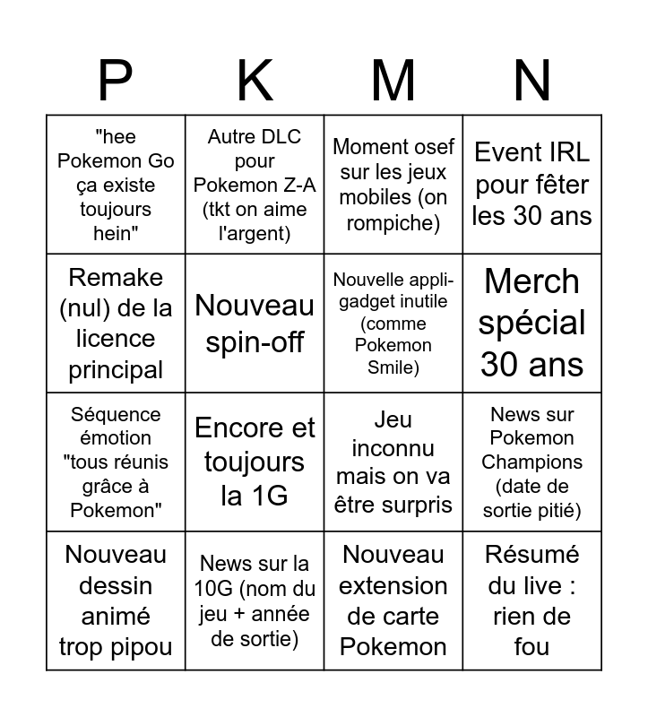 This bingo card has 16 words: News sur la 10G (nom du jeu + année de sortie), News sur Pokemon Champions (date de sortie pitié), Moment osef sur les jeux mobiles (on rompiche), "hee Pokemon Go ça existe toujours hein", Séquence émotion "tous réunis grâce à Pokemon", Autre DLC pour Pokemon Z-A (tkt on aime l'argent), Jeu inconnu mais on va être surpris, Nouveau extension de carte Pokemon, Remake (nul) de la licence principal, Nouveau spin-off, Nouveau dessin animé trop pipou, Event IRL pour fêter les 30 ans, Encore et toujours la 1G, Merch spécial 30 ans, Nouvelle appli-gadget inutile (comme Pokemon Smile) and Résumé du live : rien de fou.