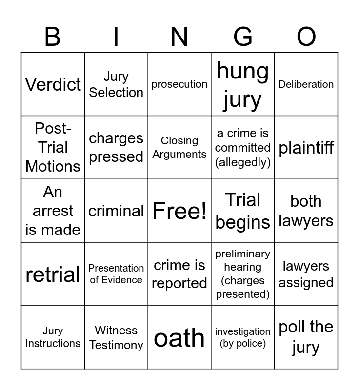 This bingo card has a free space and 24 words: Presentation of Evidence, Witness Testimony, Closing Arguments, Jury Instructions, Deliberation, Verdict, Post-Trial Motions, Jury Selection, Trial begins, crime is reported, a crime is committed (allegedly), An arrest is made, preliminary hearing (charges presented), lawyers assigned, charges pressed, investigation (by police), both lawyers, prosecution, plaintiff, criminal, poll the jury, retrial, hung jury and oath.