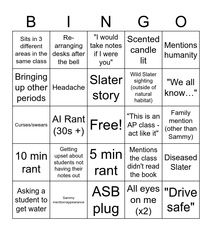 This bingo card has a free space and 29 words: Asking a student to get water, Asking a student to stop cutting her off, AI Rant (30s +), Distracted while talking, Sits in 3 different areas in the same class, "I would take notes if I were you", Headache, Getting upset about students not having their notes out, "This is an AP class - act like it", Sammy mention/appearance, Family mention (other than Sammy), "Drive safe", ASB plug, All eyes on me (x2), "We all know…", 2 min rant, 5 min rant, 10 min rant, Mentions humanity, Curses/swears, Mentions the class didn't read the book, Someone asks about an upcoming quiz/chapters to read, Wild Slater sighting (outside of natural habitat), Bringing up other periods, Scented candle lit, Re-arranging desks after the bell, Diseased Slater, Slater story and Any work read.