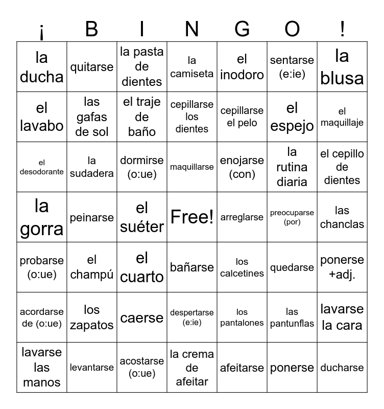 This bingo card has a free space and 58 words: el despertador, la gorra, la gorra de lana, la sudadera, el suéter, los pantalones, la blusa, la camisa, las gafas de sol, las pantunflas, la camiseta, los zapatos, el cuarto, el champú, la crema de afeitar, la ducha, el espejo, el inodoro, el jabón, el lavabo, el maquillaje, la pasta de dientes, el cepillo de dientes, la rutina diaria, la toalla, el desodorante, las chanclas, el vestido, el traje de baño, los calcetines, te ves bien / mal, acordarse de (o:ue), acostarse (o:ue), afeitarse, arreglarse, bañarse, caerse, cepillarse el pelo, cepillarse los dientes, despertarse (e:ie), dormirse (o:ue), ducharse, enojarse (con), irse, lavarse la cara, lavarse las manos, levantarse, maquillarse, peinarse, ponerse, ponerse +adj., preocuparse (por), probarse (o:ue), quedarse, quitarse, secarse, sentarse (e:ie) and sentirse (e:ie).