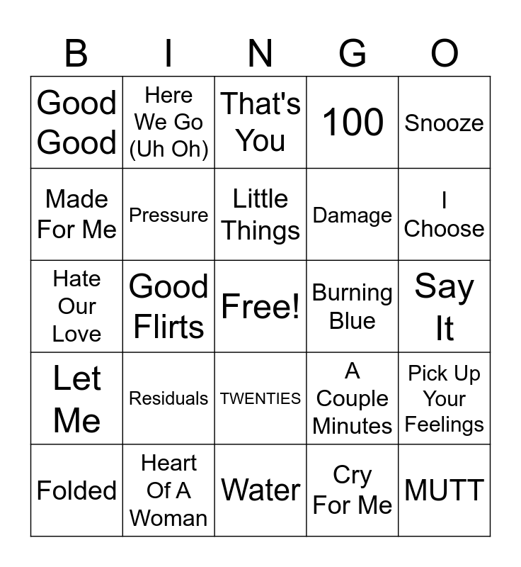 This bingo card has a free space and 24 words: Residuals, Heart Of A Woman, Little Things, Folded, Snooze, Good Good, Made For Me, Here We Go (Uh Oh), Burning Blue, TWENTIES, Damage, Hate Our Love, A Couple Minutes, Pick Up Your Feelings, Pressure, Cry For Me, Say It, That's You, I Choose, Good Flirts, MUTT, Let Me, 100 and Water.