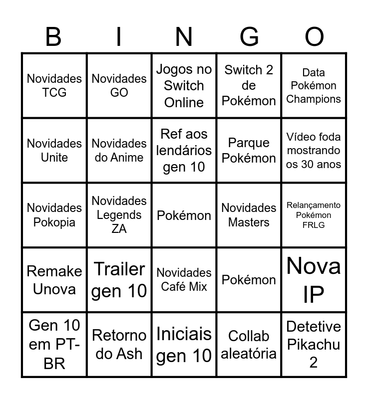 This bingo card has a free space and 25 words: Trailer gen 10, Iniciais gen 10, Ref aos lendários gen 10, Gen 10 em PT-BR, Data Pokémon Champions, Novidades TCG, Novidades Unite, Novidades GO, Novidades Masters, Novidades Café Mix, Parque Pokémon, Novidades Pokopia, Pokémon, Nova IP, Novidades do Anime, Novo filme, Relançamento Pokémon FRLG, Jogos no Switch Online, Vídeo foda mostrando os 30 anos, Novidades Legends ZA, Detetive Pikachu 2, Retorno do Ash, Remake Unova, Switch 2 de Pokémon and Collab aleatória.