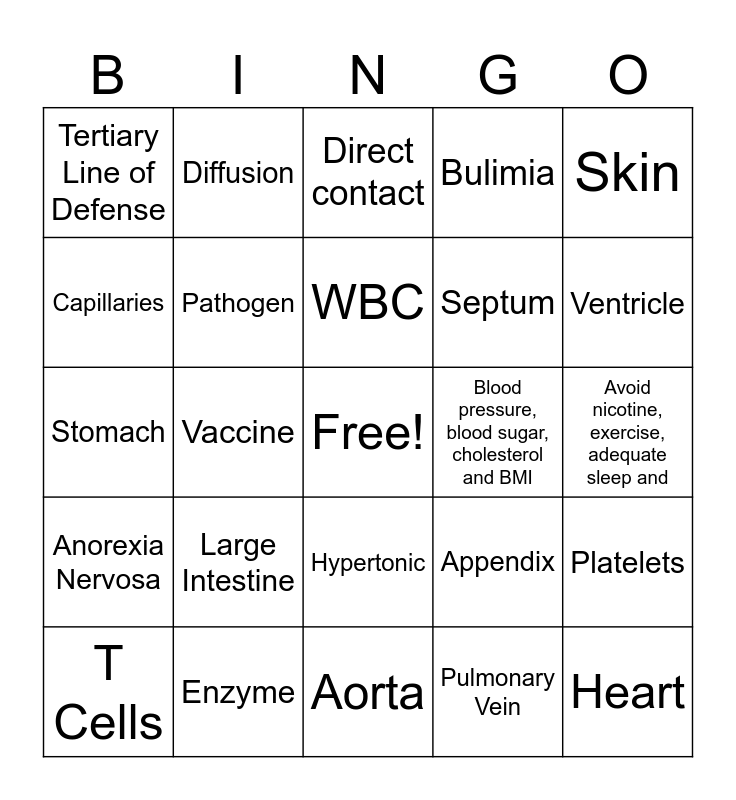 This bingo card has a free space and 24 words: Large Intestine, Enzyme, WBC, T Cells, Skin, Tertiary Line of Defense, Capillaries, Diffusion, Blood pressure, blood sugar, cholesterol and BMI, Hypertonic, Septum, Stomach, Appendix, Platelets, Pathogen, Pulmonary Vein, Avoid nicotine, exercise, adequate sleep and, Direct contact, Ventricle, Vaccine, Heart, Anorexia Nervosa, Bulimia and Aorta.