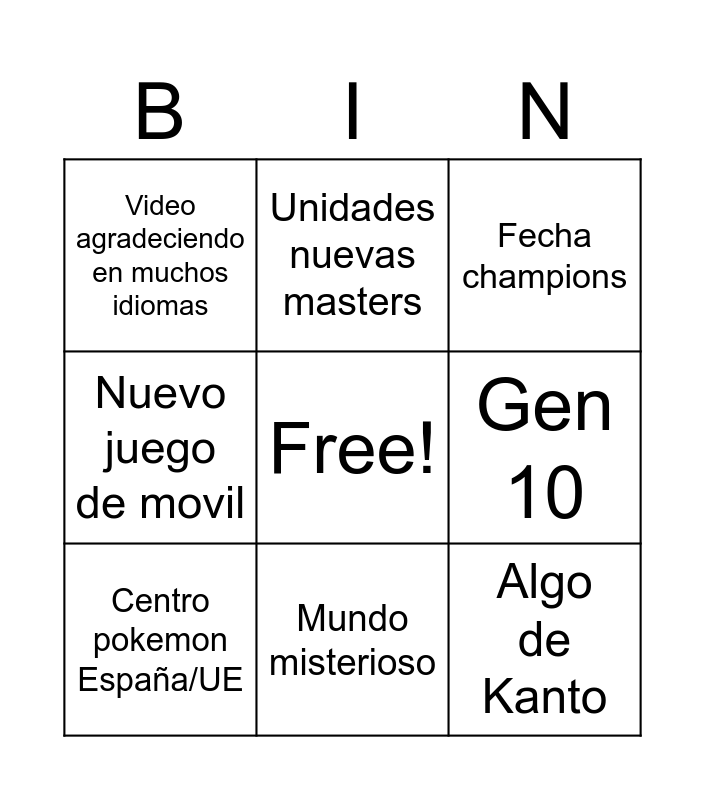 This bingo card has a free space and 8 words: Gen 10, Fecha champions, Unidades nuevas masters, Centro pokemon España/UE, Video agradeciendo en muchos idiomas, Algo de Kanto, Nuevo juego de movil and Mundo misterioso.