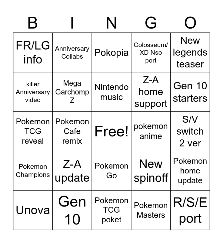 This bingo card has a free space and 24 words: Z-A update, Gen 10, Nintendo music, Unova, New legends teaser, FR/LG info, killer Anniversary video, Anniversary Collabs, pokemon anime, Pokemon Go, Z-A home support, Pokemon TCG reveal, New spinoff, Pokemon home update, Mega Garchomp Z, Pokemon Masters, S/V switch 2 ver, Pokopia, Gen 10 starters, Pokemon Cafe remix, R/S/E port, Pokemon Champions, Colosseum/ XD Nso port and Pokemon TCG poket.