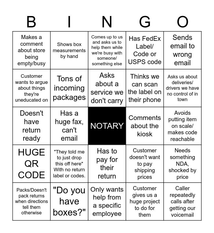This bingo card has a free space and 24 words: "They told me to just drop this off here" With no return label or codes., "Do you have boxes?", Asks about a service we don't carry, Packs/Doesn't pack returns when directions tell them otherwise, Sends email to wrong email, Makes a comment about store being empty/busy, Customer wants to argue about things they're uneducated on, Shows box measurements by hand, Comments about the kiosk, Has to pay for their return, Thinks we can scan the label on their phone, Doesn't have return ready, Customer doesn't want to pay shipping prices, Needs something NDA, shocked by price, Tons of incoming packages, Customer gives us a huge project to do for them, Avoids putting item on scale/ makes code reachable, Comes up to us and asks us to help them while we're busy with someone/ something else, Asks us about deliveries/ drivers we have no control of in town, Has a huge fax, can't email, Caller repeatedly calls after getting our voicemail, HUGE QR CODE, Has FedEx Label/ Code or USPS code and Only wants help from a specific employee.