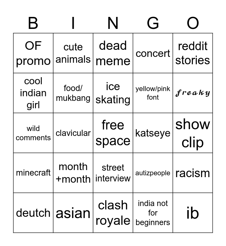 This bingo card has a free space and 24 words: month +month, asian, ice skating, deutch, reddit stories, OF promo, cool indian girl, cute animals, katseye, street interview, yellow/pink font, wild comments, autizpeople, racism, food/ mukbang, india not for beginners, show clip, dead meme, 𝓯𝓻𝓮𝓪𝓴𝔂, clavicular, ib, minecraft, concert and clash royale.