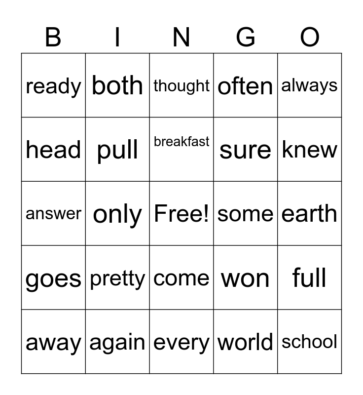 This bingo card has a free space and 24 words: pretty, again, breakfast, away, always, ready, head, both, some, come, sure, answer, won, full, pull, world, earth, thought, knew, only, school, goes, often and every.