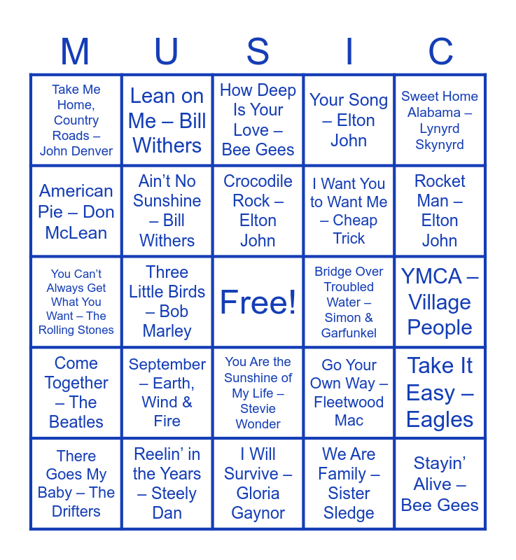 This bingo card has a free space and 50 words: Dancing Queen – ABBA, Stayin’ Alive – Bee Gees, Hotel California – Eagles, I Will Survive – Gloria Gaynor, September – Earth, Wind & Fire, Superstition – Stevie Wonder, Lean on Me – Bill Withers, Piano Man – Billy Joel, American Pie – Don McLean, Bohemian Rhapsody – Queen, Ain’t No Sunshine – Bill Withers, Your Song – Elton John, Take It Easy – Eagles, Go Your Own Way – Fleetwood Mac, Dreamer – Supertramp, Don’t Stop – Fleetwood Mac, Crocodile Rock – Elton John, Bridge Over Troubled Water – Simon & Garfunkel, Hooked on a Feeling – Blue Swede, Sweet Home Alabama – Lynyrd Skynyrd, Three Little Birds – Bob Marley, We Are Family – Sister Sledge, Take Me Home, Country Roads – John Denver, I Want You to Want Me – Cheap Trick, Night Fever – Bee Gees, Sailing – Christopher Cross, Rocket Man – Elton John, My Sharona – The Knack, How Deep Is Your Love – Bee Gees, You Are the Sunshine of My Life – Stevie Wonder, We Will Rock You – Queen, Me and Bobby McGee – Janis Joplin, I Shot the Sheriff – Eric Clapton, War – Edwin Starr, Reelin’ in the Years – Steely Dan, December, 1963 (Oh, What a Night) – The Four Seasons, Play That Funky Music – Wild Cherry, Sir Duke – Stevie Wonder, Annie’s Song – John Denver, YMCA – Village People, Bad Moon Rising – Creedence Clearwater Revival, Surfin’ U.S.A. – The Beach Boys, Dancing in the Street – Martha and the Vandellas, Wooly Bully – Sam the Sham and the Pharaohs, There Goes My Baby – The Drifters, You Can’t Always Get What You Want – The Rolling Stones, Crimson and Clover – Tommy James & the Shondells, She’s Not There – The Zombies, Come Together – The Beatles and Somebody to Love – Jefferson Airplane.