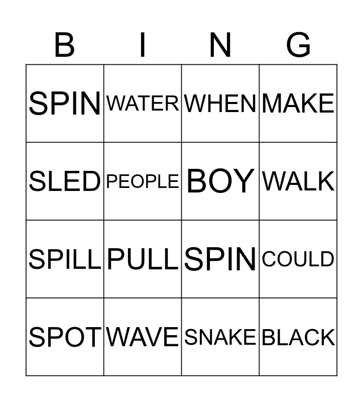 This bingo card has 16 words: WAVE, COULD, WHEN, SPIN, SPILL, WATER, SPIN, SNAKE, SLED, PEOPLE, SPOT, MAKE, PULL, WALK, BOY and BLACK.