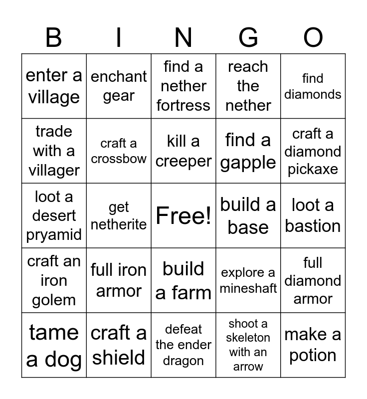 This bingo card has a free space and 24 words: full iron armor, craft a shield, kill a creeper, tame a dog, find diamonds, enter a village, trade with a villager, enchant gear, build a base, build a farm, find a gapple, loot a desert pryamid, explore a mineshaft, full diamond armor, craft a crossbow, shoot a skeleton with an arrow, loot a bastion, find a nether fortress, craft a diamond pickaxe, get netherite, make a potion, craft an iron golem, reach the nether and defeat the ender dragon.