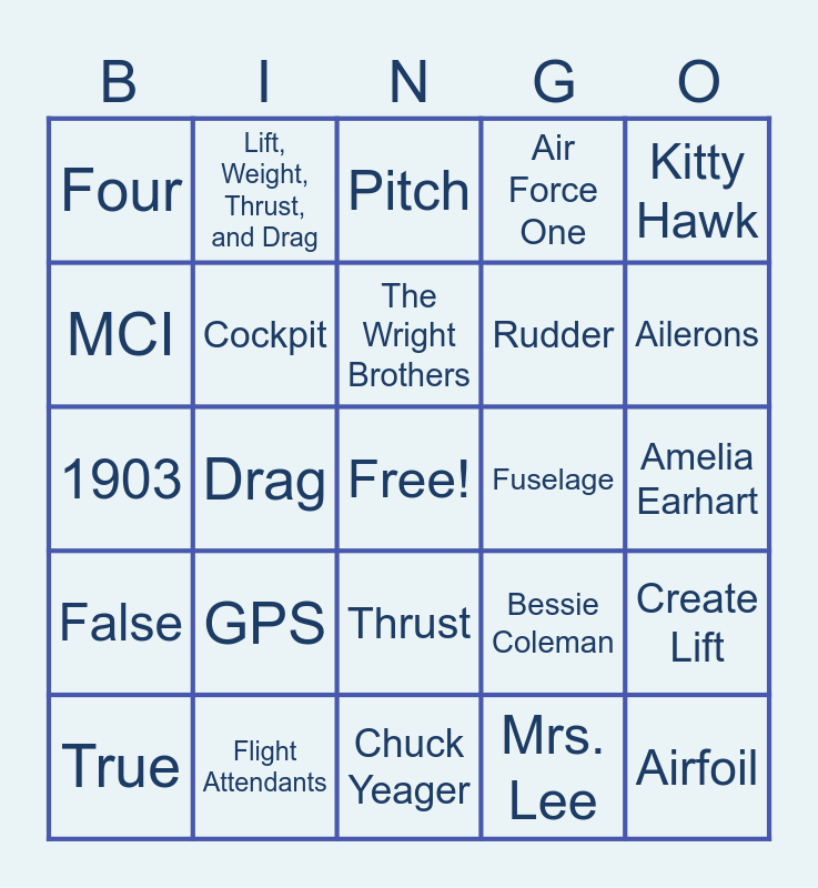 This bingo card has a free space and 24 words: GPS, Flight Attendants, The Wright Brothers, True, Kitty Hawk, Four, MCI, Lift, Weight, Thrust, and Drag, Fuselage, Thrust, Rudder, 1903, Bessie Coleman, Create Lift, Cockpit, Mrs. Lee, Amelia Earhart, Pitch, Ailerons, Drag, Airfoil, False, Air Force One and Chuck Yeager.