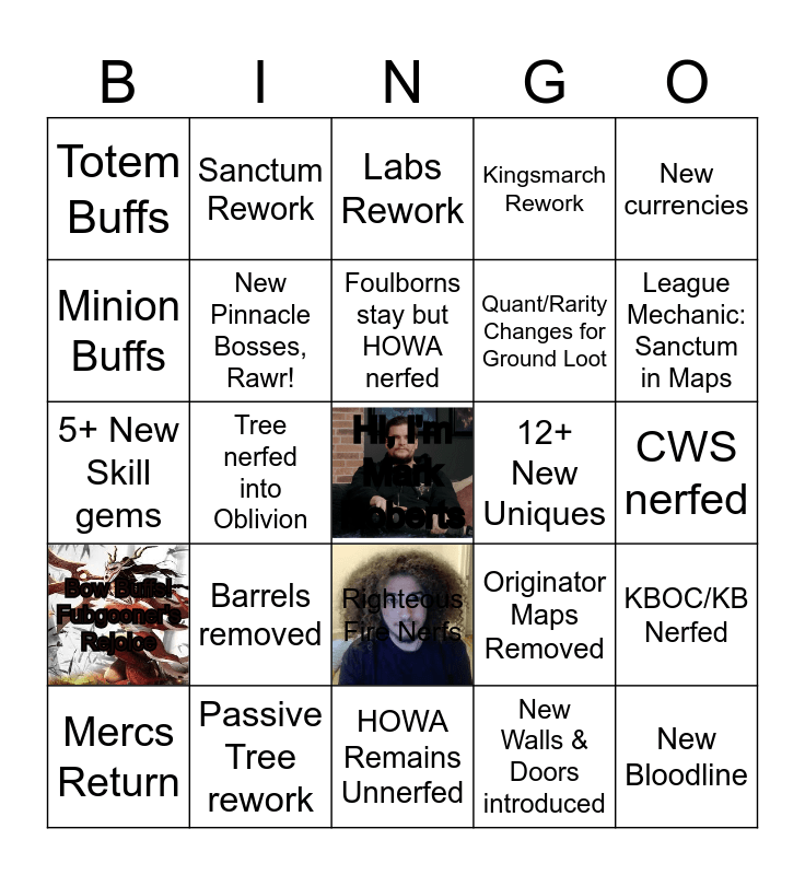 This bingo card has 2 images, a free space and 32 words: New Walls & Doors introduced, Stacker Nerfs, Tree nerfed into Oblivion, Scion gets 1 new ascendancy, Bow Buffs! Fubgooner's Rejoice, New Pinnacle Bosses, Rawr!, New currencies, KBOC/KB Nerfed, Sanctum Rework, Scion gets 2 new ascendancies, Foulborns stay but HOWA nerfed, Labs Rework, Scarab Nerfs, T17 Rework, 12+ New Uniques, New Support Gems, Mercs Return, 5+ New Skill gems, Righteous Fire Nerfs, Barrels removed, Originator Maps Removed, Older Ascendancy's Reworked, CWS nerfed, Passive Tree rework, New Bloodline, Kingsmarch Rework, Quant/Rarity Changes for Ground Loot, Minion Buffs, Totem Buffs, HOWA Remains Unnerfed, Chinese POE Features Added and League Mechanic: Sanctum in Maps.