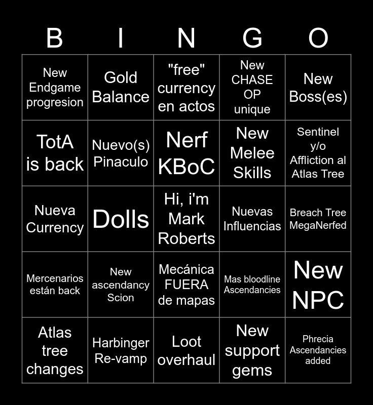 This bingo card has a free space and 24 words: New ascendancy Scion, Harbinger Re-vamp, Nerf KBoC, Atlas tree changes, New Boss(es), New Endgame progresion, TotA is back, Gold Balance, Nuevas Influencias, Mecánica FUERA de mapas, New Melee Skills, Nueva Currency, Mas bloodline Ascendancies, New NPC, Nuevo(s) Pinaculo, New support gems, Breach Tree MegaNerfed, "free" currency en actos, Sentinel y/o Affliction al Atlas Tree, Dolls, Phrecia Ascendancies added, Mercenarios están back, New CHASE OP unique and Loot overhaul.