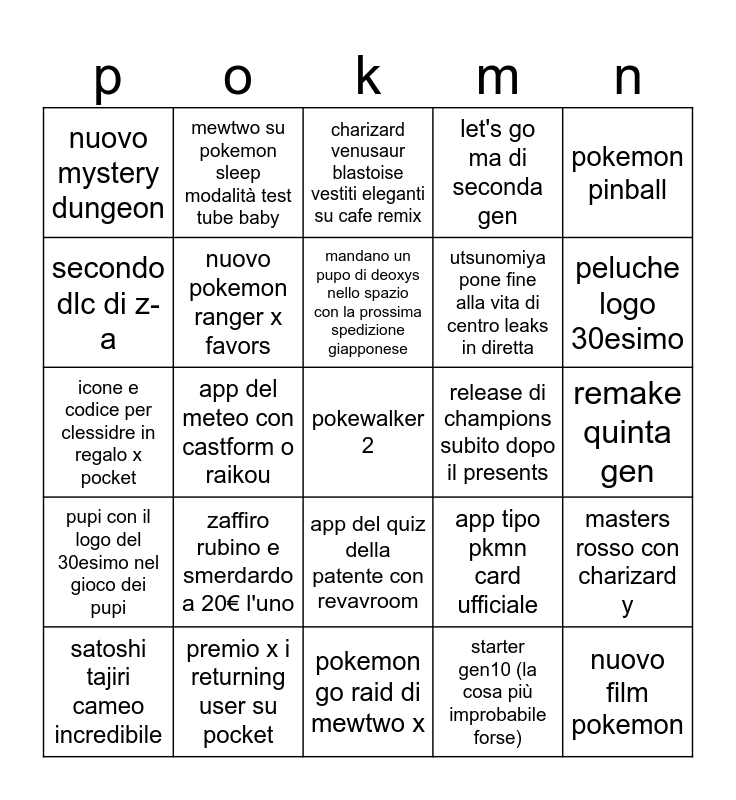This bingo card has a free space and 24 words: zaffiro rubino e smerdardo a 20€ l'uno, premio x i returning user su pocket, mandano un pupo di deoxys nello spazio con la prossima spedizione giapponese, satoshi tajiri cameo incredibile, pokemon pinball, nuovo mystery dungeon, secondo dlc di z-a, mewtwo su pokemon sleep modalità test tube baby, release di champions subito dopo il presents, app del quiz della patente con revavroom, utsunomiya pone fine alla vita di centro leaks in diretta, icone e codice per clessidre in regalo x pocket, app tipo pkmn card ufficiale, masters rosso con charizard y, nuovo pokemon ranger x favors, starter gen10 (la cosa più improbabile forse), remake quinta gen, charizard venusaur blastoise vestiti eleganti su cafe remix, peluche logo 30esimo, app del meteo con castform o raikou, nuovo film pokemon, pupi con il logo del 30esimo nel gioco dei pupi, let's go ma di seconda gen and pokemon go raid di mewtwo x.