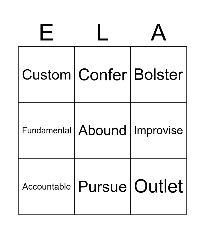 This bingo card has a free space and 9 words: Accountable, Bolster, Confer, Fundamental, Custom, Improvise, Outlet, Overwhelm and Pursue.