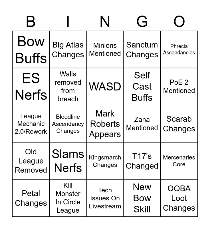 This bingo card has a free space and 24 words: Slams Nerfs, Kill Monster In Circle League, WASD, Petal Changes, Phrecia Ascendancies, Bow Buffs, ES Nerfs, Big Atlas Changes, Zana Mentioned, Kingsmarch Changes, Self Cast Buffs, League Mechanic 2.0/Rework, T17's Changed, Mercenaries Core, Walls removed from breach, New Bow Skill, Scarab Changes, Minions Mentioned, PoE 2 Mentioned, Bloodline Ascendancy Changes, OOBA Loot Changes, Old League Removed, Sanctum Changes and Tech Issues On Livestream.