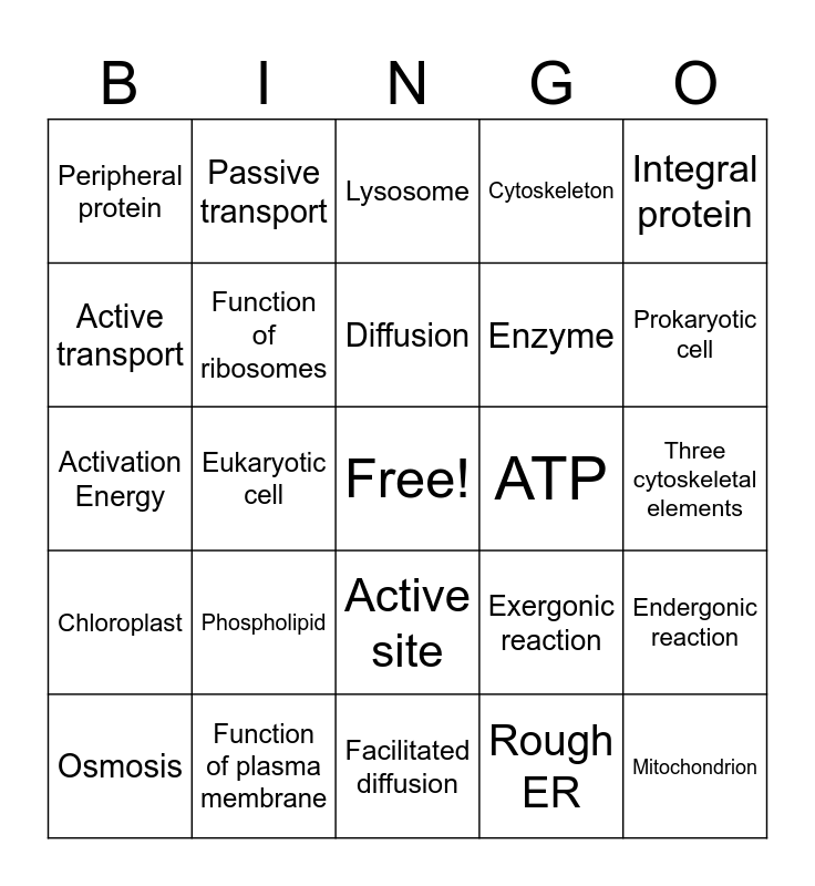 This bingo card has a free space and 24 words: Phospholipid, Function of plasma membrane, Diffusion, Osmosis, Integral protein, Peripheral protein, Active transport, Passive transport, ATP, Active site, Enzyme, Activation Energy, Exergonic reaction, Endergonic reaction, Function of ribosomes, Rough ER, Three cytoskeletal elements, Lysosome, Prokaryotic cell, Eukaryotic cell, Mitochondrion, Chloroplast, Cytoskeleton and Facilitated diffusion.