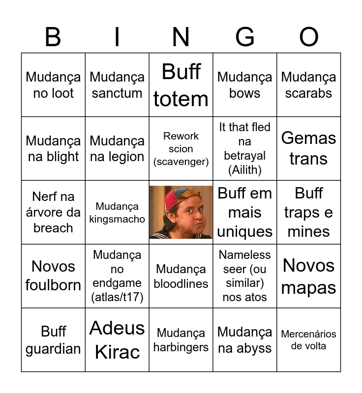 This bingo card has a free space and 24 words: Mudança no endgame (atlas/t17), Adeus Kirac, Rework scion (scavenger), Buff guardian, Mudança scarabs, Mudança no loot, Mudança na blight, Mudança sanctum, Buff em mais uniques, Mudança bloodlines, It that fled na betrayal (Ailith), Nerf na árvore da breach, Nameless seer (ou similar) nos atos, Novos mapas, Mudança na legion, Mudança na abyss, Buff traps e mines, Buff totem, Gemas trans, Mudança kingsmacho, Mercenários de volta, Novos foulborn, Mudança bows and Mudança harbingers.
