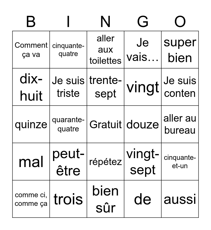 This bingo card has a free space and 24 words: peut-être, trois, trente-sept, comme ci, comme ça, super bien, Comment ça va, dix-huit, cinquante-quatre, douze, répétez, vingt, quinze, vingt-sept, cinquante-et-un, Je suis triste, de, aller au bureau, aller aux toilettes, Je suis conten, quarante-quatre, aussi, mal, Je vais… and bien sûr.