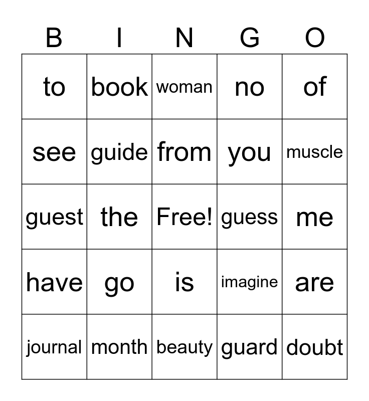This bingo card has a free space and 63 words: I, a, and, are, as, be, book, do, from, he, is, look, me, of, said, see, the, to, was, you, go, have, no, so, February, Wednesday, breakfast, favorite, character, machine, science, island, sign, answer, muscle, journal, journey, guard, guy, guide, guest, guess, business, height, doubt, month, whole, imagine, forward, backward, beautiful, beauty, cough, false, women, woman, every, prove, shoe, floor, poor, door and through.