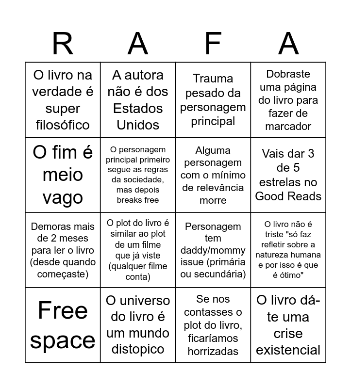 This bingo card has 16 words: O universo do livro é um mundo distopico, O livro não é triste "só faz refletir sobre a natureza humana e por isso é que é ótimo", Trauma pesado da personagem principal, O livro na verdade é super filosófico, Demoras mais de 2 meses para ler o livro (desde quando começaste), A autora não é dos Estados Unidos, Personagem tem daddy/mommy issue (primária ou secundária), Se nos contasses o plot do livro, ficaríamos horrizadas, O fim é meio vago, O personagem principal primeiro segue as regras da sociedade, mas depois breaks free, Free space, Dobraste uma página do livro para fazer de marcador, O plot do livro é similar ao plot de um filme que já viste (qualquer filme conta), Vais dar 3 de 5 estrelas no Good Reads, Alguma personagem com o mínimo de relevância morre and O livro dá-te uma crise existencial.