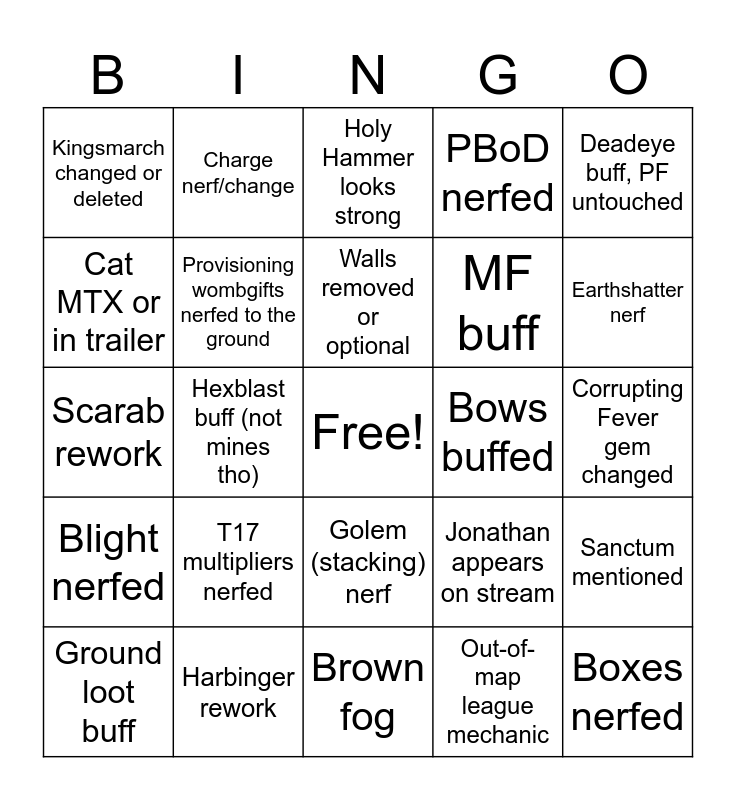 This bingo card has a free space and 24 words: T17 multipliers nerfed, Harbinger rework, Walls removed or optional, Ground loot buff, Deadeye buff, PF untouched, Kingsmarch changed or deleted, Cat MTX or in trailer, Charge nerf/change, Bows buffed, Golem (stacking) nerf, MF buff, Scarab rework, Jonathan appears on stream, Sanctum mentioned, Provisioning wombgifts nerfed to the ground, Out-of-map league mechanic, Corrupting Fever gem changed, Holy Hammer looks strong, Earthshatter nerf, Hexblast buff (not mines tho), Boxes nerfed, Blight nerfed, PBoD nerfed and Brown fog.