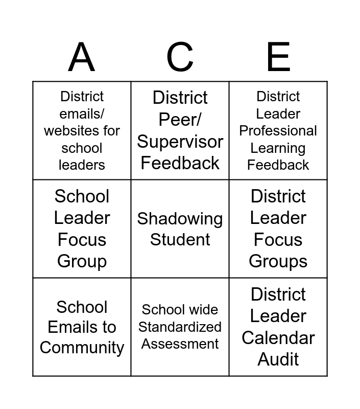 This bingo card has 27 words: Cabinet Meeting Agendas, District Leader Surveys, District Leader Calendar Audit, District Leader Attendance, District Leader Focus Groups, District Leader Professional Learning Feedback, District Peer/ Supervisor Feedback, District Leader Exit Interviews, School Meeting Agendas, School Rating/ Report Card, School Professional Learning Surveys, School Leader Focus Group, School Master Schedule, Teacher Attendance, School Calendar, School Leader Attendance, School Emails to Community, School wide Standardized Assessment, Classroom level standardized attendance, District emails/ websites for school leaders, Student Focus Groups, Parent Focus Groups, Community Perception Survey, Shadowing School Leader, Shadowing Teacher, Shadowing Student and Curriculum Audit.