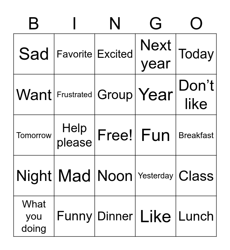 This bingo card has a free space and 29 words: What you doing, Where are you going?, Help please, Happy, Sad, Excited, Frustrated, Mad, Fun, Funny, Breakfast, Lunch, Dinner, Like, Don’t like, Morning, Noon, Night, Today, Tomorrow, Yesterday, Don’t want, Year, Want, Next year, Favorite, Class, Group and Family.