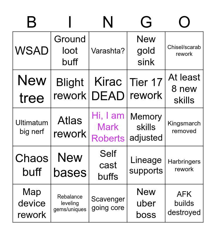 This bingo card has a free space and 24 words: New bases, Rebalance leveling gems/uniques, Kirac DEAD, Map device rework, Chisel/scarab rework, WSAD, New tree, Ground loot buff, Memory skills adjusted, Self cast buffs, Tier 17 rework, Ultimatum big nerf, Lineage supports, Harbringers rework, Blight rework, New uber boss, Kingsmarch removed, Varashta?, At least 8 new skills, Atlas rework, AFK builds destroyed, Chaos buff, New gold sink and Scavenger going core.