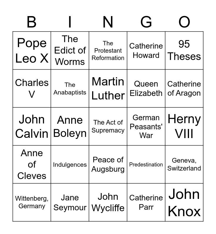 This bingo card has 25 words: Indulgences, John Wycliffe, Martin Luther, Wittenberg, Germany, 95 Theses, Pope Leo X, Charles V, The Edict of Worms, German Peasants' War, Peace of Augsburg, Queen Elizabeth, John Calvin, Predestination, Geneva, Switzerland, The Anabaptists, John Knox, Herny VIII, The Protestant Reformation, Catherine of Aragon, Anne Boleyn, The Act of Supremacy, Jane Seymour, Anne of Cleves, Catherine Howard and Catherine Parr.
