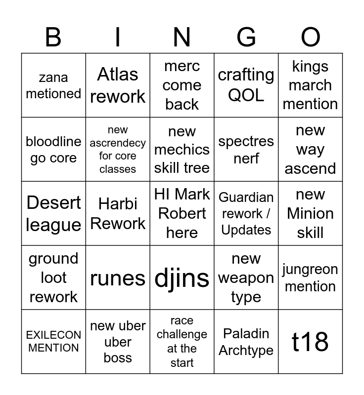 This bingo card has a free space and 24 words: runes, new uber uber boss, new mechics skill tree, EXILECON MENTION, kings march mention, zana metioned, bloodline go core, Atlas rework, Guardian rework / Updates, djins, spectres nerf, Desert league, new weapon type, jungreon mention, new ascrendecy for core classes, Paladin Archtype, new Minion skill, merc come back, new way ascend, Harbi Rework, t18, ground loot rework, crafting QOL and race challenge at the start.