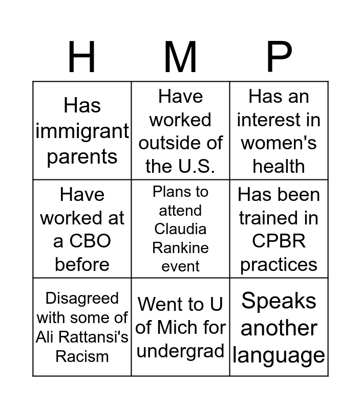 This bingo card has 9 words: Disagreed with some of Ali Rattansi's Racism, Has an interest in women's health, Have worked outside of the U.S., Have worked at a CBO before, Has immigrant parents, Has been trained in CPBR practices, Plans to attend Claudia Rankine event, Speaks another language and Went to U of Mich for undergrad.