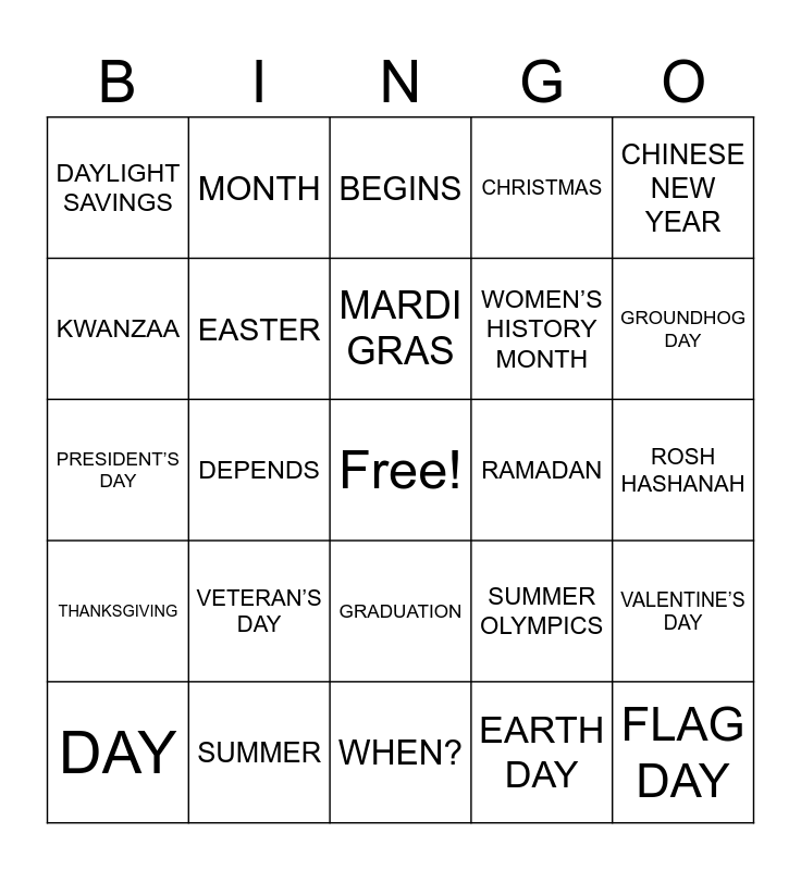 This bingo card has a free space and 25 words: VETERAN’S DAY, WHEN?, MARDI GRAS, DAY, CHINESE NEW YEAR, DAYLIGHT SAVINGS, KWANZAA, MONTH, RAMADAN, GRADUATION, WOMEN’S HISTORY MONTH, PRESIDENT’S DAY, SUMMER OLYMPICS, VALENTINE’S DAY, EASTER, MEMORIAL DAY, ROSH HASHANAH, BEGINS, GROUNDHOG DAY, DEPENDS, FLAG DAY, SUMMER, THANKSGIVING, CHRISTMAS and EARTH DAY.