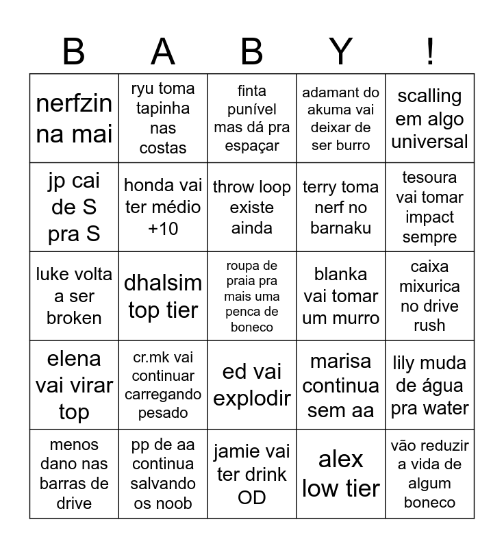 This bingo card has a free space and 24 words: cr.mk vai continuar carregando pesado, pp de aa continua salvando os noob, throw loop existe ainda, menos dano nas barras de drive, scalling em algo universal, nerfzin na mai, jp cai de S pra S, ryu toma tapinha nas costas, blanka vai tomar um murro, ed vai explodir, terry toma nerf no barnaku, luke volta a ser broken, marisa continua sem aa, lily muda de água pra water, honda vai ter médio +10, alex low tier, caixa mixurica no drive rush, finta punível mas dá pra espaçar, tesoura vai tomar impact sempre, dhalsim top tier, vão reduzir a vida de algum boneco, elena vai virar top, adamant do akuma vai deixar de ser burro and jamie vai ter drink OD.