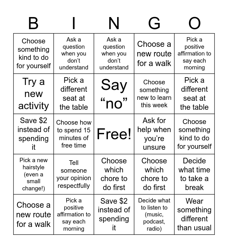 This bingo card has a free space and 48 words: Choose a new snack, Wear something different than usual, Choose a song for the car or house, Save $2 instead of spending it, Tell someone your opinion respectfully, Decide what to watch for 30 minutes, Ask a question when you don’t understand, Say “I need time to decide”, Try a new activity, Choose what to have for breakfast, Pick a different seat at the table, Choose a new route for a walk, Decide what time to take a break, Choose which chore to do first, Pick a new hairstyle, Choose which game to play with someone, Say “no”, Ask for help when you’re unsure, Choose a goal for the week, Pick a positive affirmation to say each morning, Choose how to spend 15 minutes of free time, Decide what to listen to (music, podcast, radio), Choose something kind to do for yourself, Choose something new to learn this week, Choose what to have for breakfast one day, Pick a different seat at the table, Choose a new route for a walk, Decide what time to take a break, Choose which chore to do first, Pick a new hairstyle (even a small change!), Choose which game to play with someone, Say “no” to something you don’t want to do (respectfully), Ask for help when you’re unsure, Choose a goal for the week, Pick a positive affirmation to say each morning, Choose how to spend 15 minutes of free time, Decide what to listen to (music, podcast, radio), Choose something kind to do for yourself, Choose a new snack this week, Wear something different than usual, Choose a song for the car or house, Decide what to watch for 30 minutes, Ask a question when you don’t understand, Say “I need time to decide”, Save $2 instead of spending it, Try a new activity, Tell someone your opinion respectfully and Choose something new to learn this week.