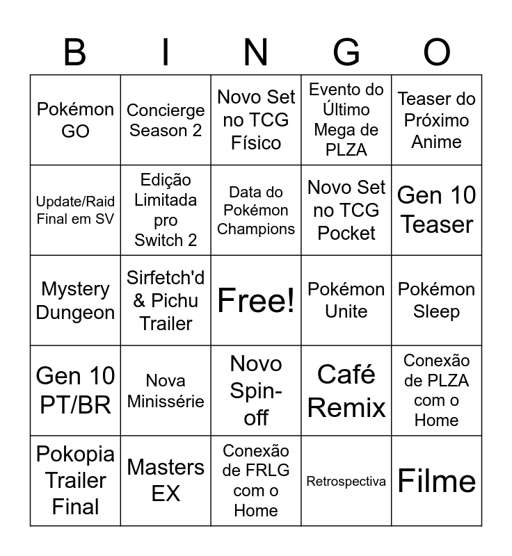 This bingo card has a free space and 24 words: Nova Minissérie, Masters EX, Data do Pokémon Champions, Pokopia Trailer Final, Teaser do Próximo Anime, Pokémon GO, Update/Raid Final em SV, Concierge Season 2, Pokémon Unite, Novo Spin-off, Novo Set no TCG Pocket, Mystery Dungeon, Café Remix, Conexão de PLZA com o Home, Edição Limitada pro Switch 2, Retrospectiva, Pokémon Sleep, Novo Set no TCG Físico, Gen 10 Teaser, Sirfetch'd & Pichu Trailer, Filme, Gen 10 PT/BR, Evento do Último Mega de PLZA and Conexão de FRLG com o Home.