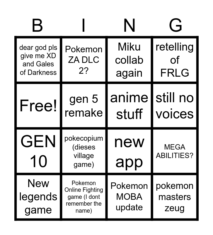 This bingo card has 16 words: Pokemon Online Fighting game (I dont remember the name), MEGA ABILITIES?, Miku collab again, dear god pls give me XD and Gales of Darkness, GEN 10, Pokemon ZA DLC 2?, new app, Pokemon MOBA update, Free!, gen 5 remake, New legends game, retelling of FRLG, pokecopium (dieses village game), still no voices, anime stuff and pokemon masters zeug.